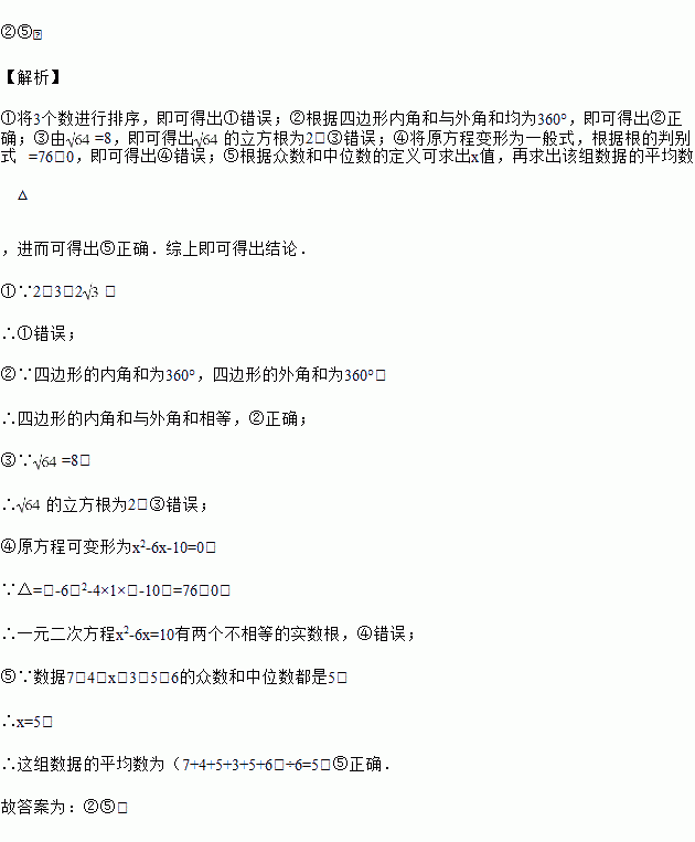 ⑤若一组数据7,4,x,3,5,6的众数和中位数都是5,则这组数据的平均数也是5.