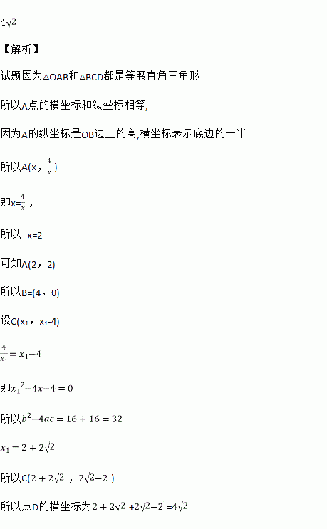 如图,△AOB,△CBD是等腰直角三角形,点A,C在函数y= (x>0)的图象上,斜边OB,BD都在x轴上,则点D的横坐标是________.