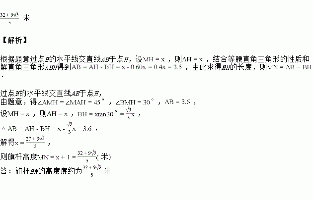 ,已知每层楼的窗台离该层的地面高度均为1米,求旗杆MN的高度结果保留根号![]()