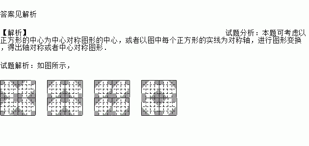 请你用四块如图1所示的瓷砖图案为“基本单位”, 在图2、图3中分别设计出一个正方形的地板图案,使拼铺的图案成轴对称图形或中心对称图形. (要求:两种拼法各不相同,所画图案阴影部分用斜线表示.)