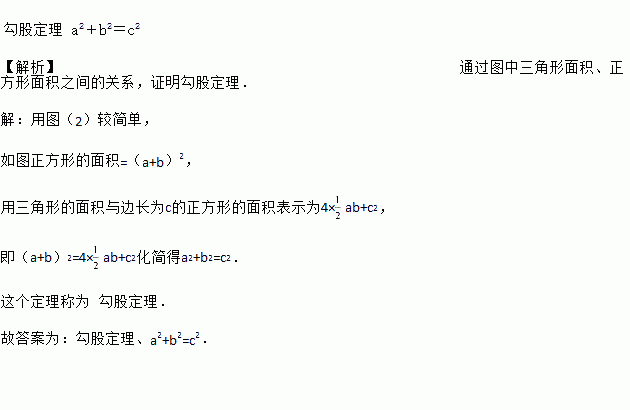 利用图1或图2两个图形中的有关面积的等量关系都能证明数学中一个十分著名的定理,这个定理称为______________,该定理结论的数学表达式是____________________