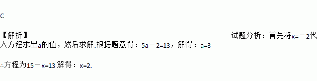 C 【解析】试题分析:首先将x=-2代入方程求出a的值,然后求解.根据题意得:5a-2=13,解得:a=3 ∴方程为15-x=13 解得:x=2.
