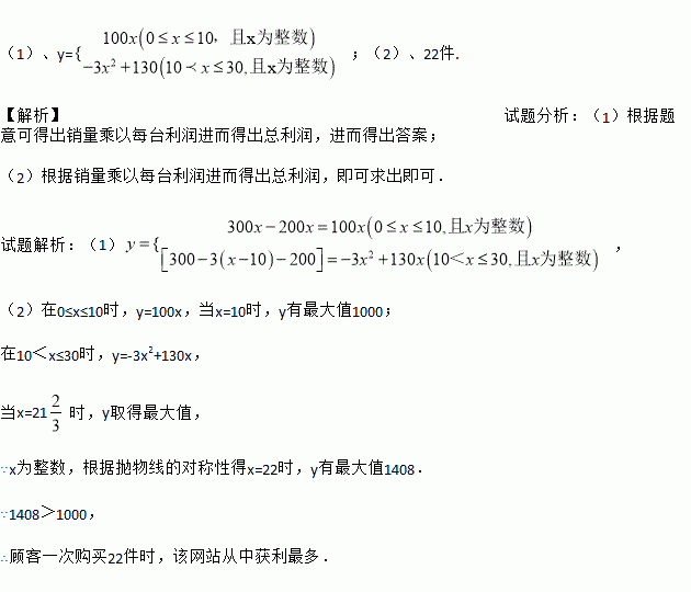 (1)、y=;(2)、22件. 【解析】试题分析:(1)根据题意可得出销量乘以每台利润进而得出总利润,进而得出答案; (2)根据销量乘以每台利润进而得出总利润,即可求出即可. 试题解析:(1), (2)在0≤x≤10时,y=100x,当x=10时,y有最大值1000; 在10<x≤30时,y=-3x2+130x, 当x=21时,y取得最大值, ∵x为整数,...