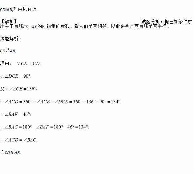 如图,∠BAF=46°,∠ACE=136°,CE⊥CD.问CD∥AB吗?为什么?