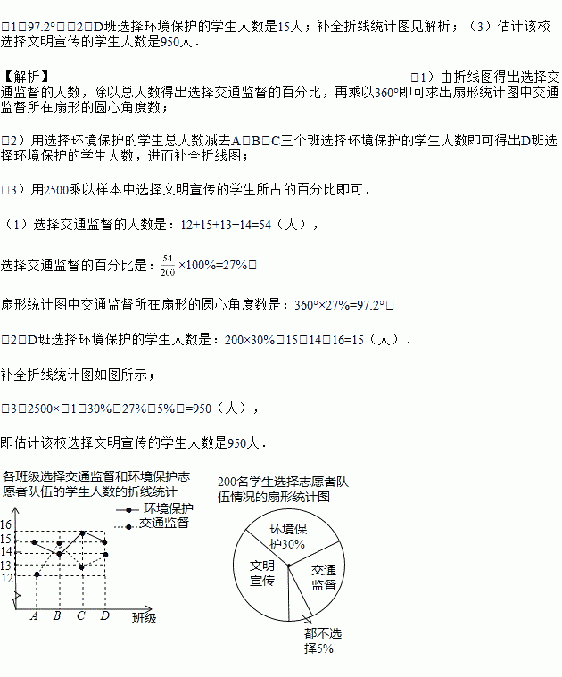某校积极开展中学生社会实践活动,决定成立文明宣传、环境保护、交通监督三个志愿者队伍,每名学生最多选择一个队伍,为了了解学生的选择意向,随机抽取A,B,C,D四个班,共200名学生进行调查.将调查得到的数据进行整理,绘制成如下统计图(不完整)