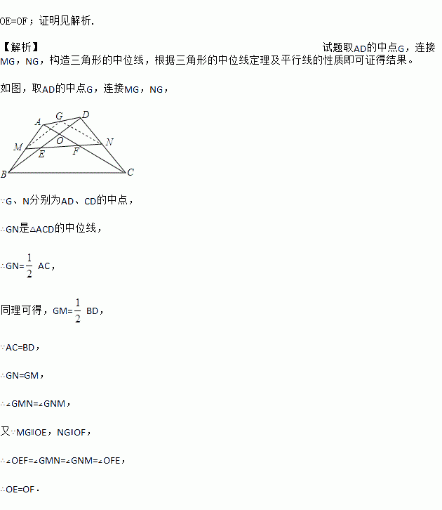 如图,已知四边形ABCD的对角线AC与BD相交于点O,且AC=BD,M,N分别是AB、CD的中点,MN分别交BD、AC于点E、F.你能说出OE与OF的大小关系并加以证明吗?