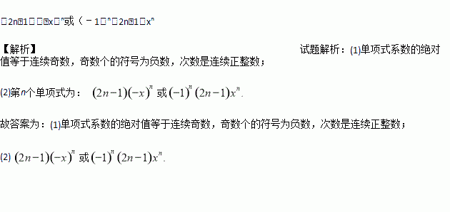 观察下列单项式:﹣x,3x2,﹣5x3,7x4,…﹣37x19,39x20的特点,写出第n个单项式.为了解决这个问题,特提供下面的解题思路:(1)先观察这组单项式系数的符号及绝对值的规律;(2)再看这组单项式次数的规律.请根据你的经验,猜想第n个单项式可表示为_____.(用含n的式子表示)