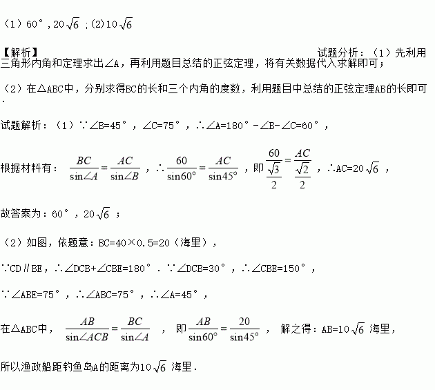 (1)如图(2),△ABC中,∠B=45°,∠C=75°,BC=60,则∠A= ;AC= ;
