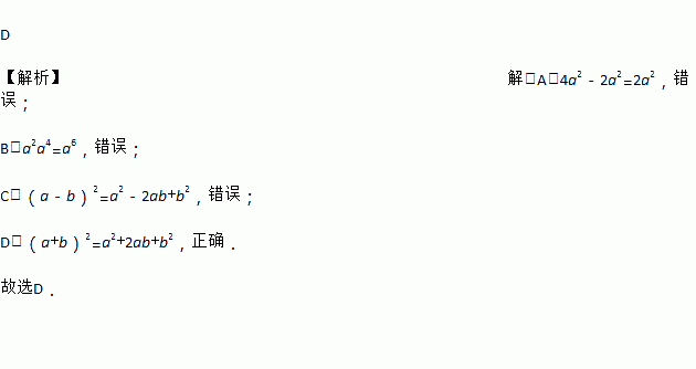 A. 4a2-2a2=2 B. a2•a4=a3 C. (a-b)2=a2-b2 D. (a+b)2=a2+2ab+b2