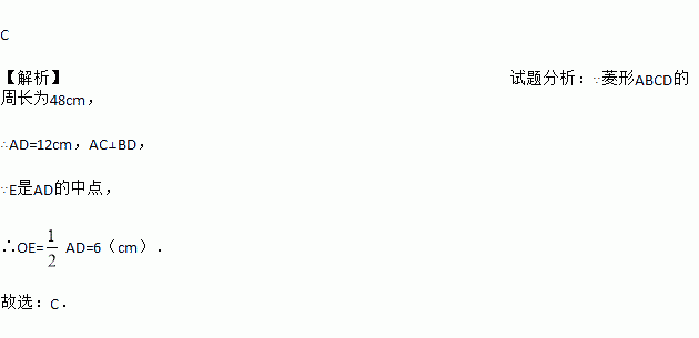 如图,菱形ABCD的周长为48cm,对角线AC、BD相交于O点,E是AD的中点,连接OE,则线段OE的长等于( )