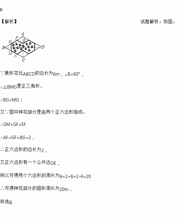 如图,菱形花坛 ABCD的边长为 6m,∠B=60°,其中由两个正六边形组成的图形部分种花,则种花部分的图形的周长(粗线部分)为( )