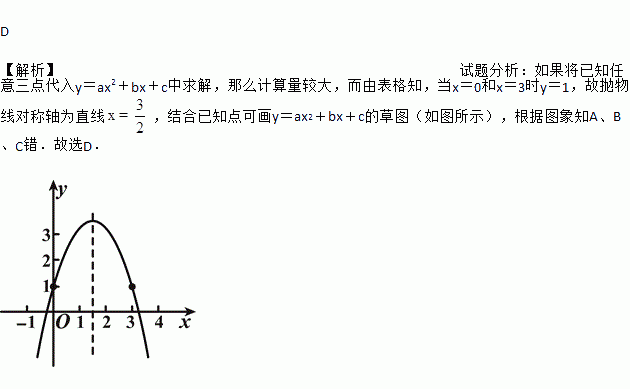 D 【解析】试题分析:如果将已知任意三点代入y=ax2+bx+c中求解,那么计算量较大,而由表格知,当x=0和x=3时y=1,故抛物线对称轴为直线,结合已知点可画y=ax2+bx+c的草图(如图所示),根据图象知A、B、C错.故选D.