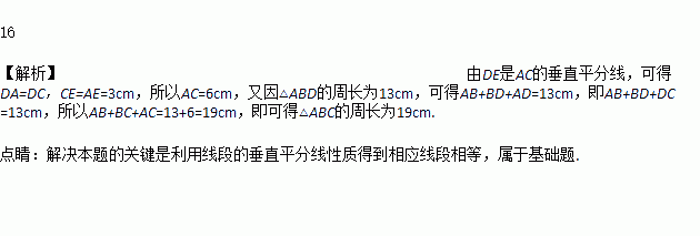 如图,△ABC中,DE是AC的中垂线,且AE =3cm,△ABD周长为13cm,那么△ABC的周长是_____cm.