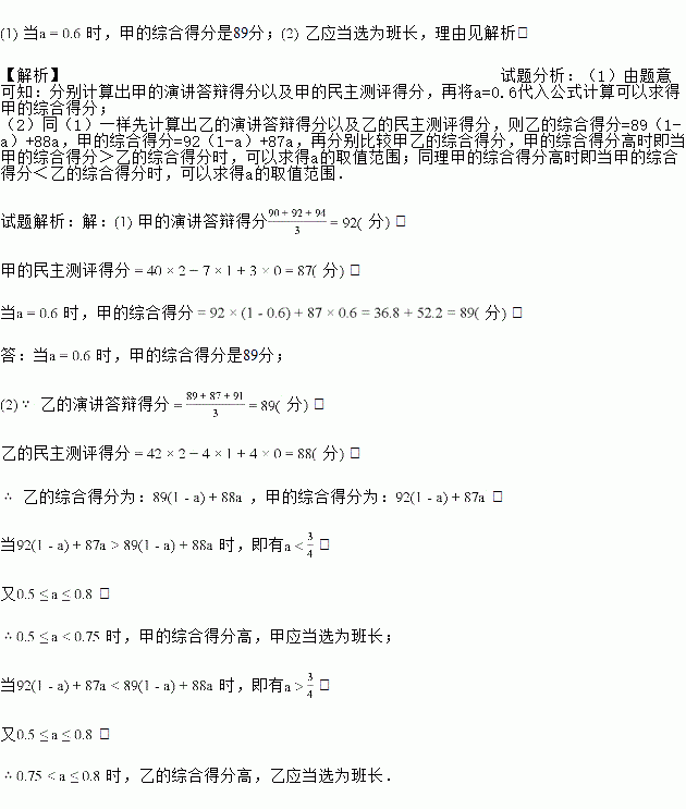 某班为了从甲、乙两位同学中选出班长,进行了一次演讲答辩与民主测评,A、B、C、D、E五位老师作为评委,对“演讲答辩”情况进行评价,全班50位同学参与了民主测评结果如表所示:![]()