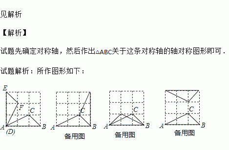 在3×3的正方形格点图中,有格点△ABC和格点△DEF,且△ABC和△DEF关于某直线成轴对称,请分别在下面四个图中各画出1个这样的△DEF,要求四个图互不一样.