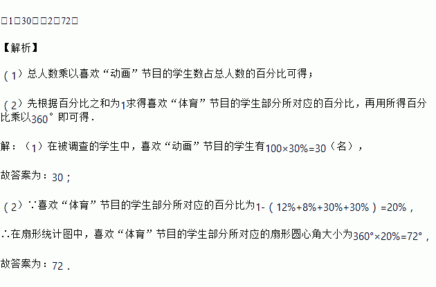 为了解全校学生对新闻,体育.动画、娱乐、戏曲五类电视节目的喜爱情况,机调查了100名学生,结果如扇形图所示,依据图中信息,回答下列问题: