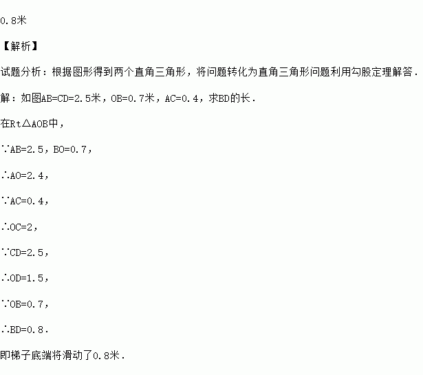 如图,一架长2.5m的梯子,斜靠在一竖直的墙上,这时,梯底距墙底端0.7m,如果梯子的顶端沿墙下滑0.4m,则梯子的底端将滑出多少米?