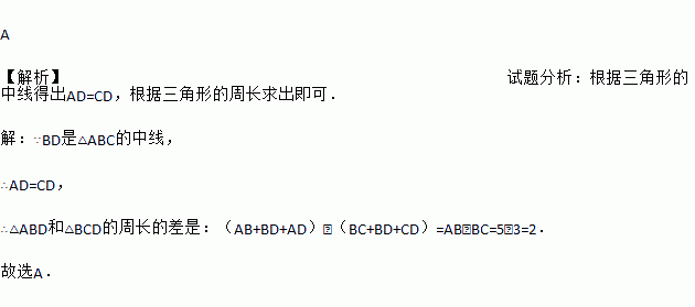 A 【解析】试题分析:根据三角形的中线得出AD=CD,根据三角形的周长求出即可. 【解析】 ∵BD是△ABC的中线, ∴AD=CD, ∴△ABD和△BCD的周长的差是:(AB+BD+AD)﹣(BC+BD+CD)=AB﹣BC=5﹣3=2. 故选A.