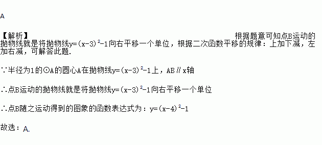 如图,半径为1的的圆心A在抛物线y=(x-3)2-1上,AB//x轴交 ![]()