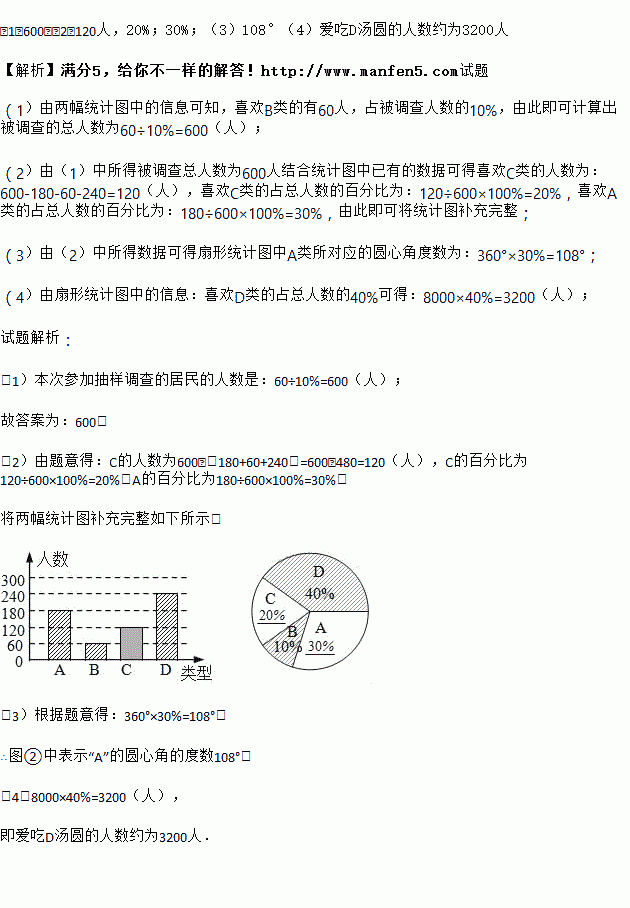 (4)若居民区有8000人,请估计爱吃D汤圆的人数.
