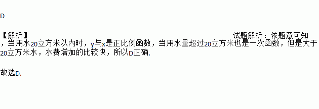 为了鼓励节约用水,按以下规定收取水费:(1)每户每月用水量不超过20立方米,则每立方米水费1.8元;(2)若每户每月用水量超过20立方米,则超过部分每立方米水费3元.设某户一个月所交水费为y(元),用水量为x(立方米),则y与x的函数关系用图象表示为( )