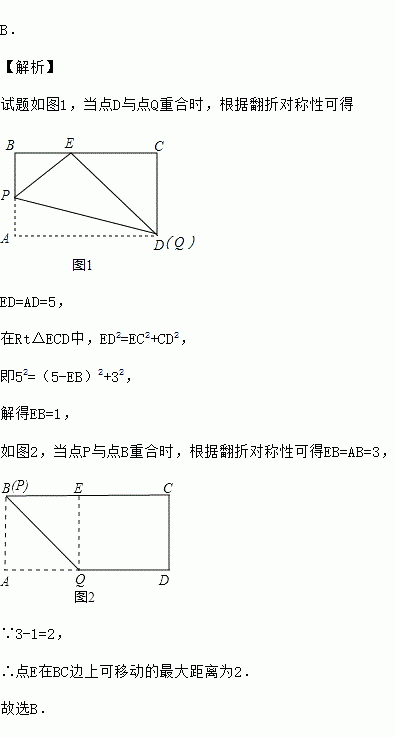 如图,矩形纸片ABCD,AB=3,AD=5,折叠纸片,使点A落在BC边上的E处,折痕为PQ,当点E在BC边上移动时,折痕的端点P、Q也随之移动.若限定点P、Q分别在AB、AD边上移动,则点E在BC边上可移动的最大距离为( )