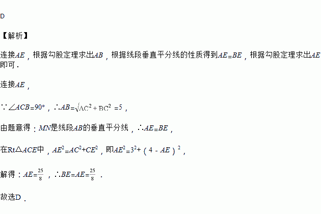 AB)为半径作弧,两弧相交于点M和N点,作直线MN交AB于点D,交BC于点E,若AC=3,BC=4,则BE等于( )