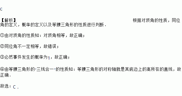 下列说法:①对顶角相等;②同位角相等;③必然事件发生的概率为 ;④等腰三角形的对称轴就是其底边上的高所在的直线,其中正确的有( )