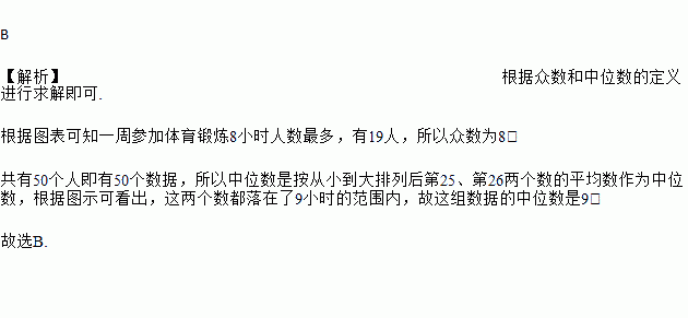 如图是根据某班50名同学一周的体育锻炼情况绘制的条形统计图,则这个班50名同学一周参加体育锻炼时间的众数与中位数分别为( )