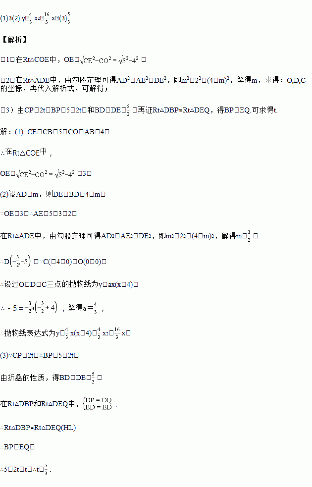 (3)一动点P从点C 出发,沿CB以每秒2 个单位长的速度向点B运动,同时动点Q从E 点出发,沿EC以每秒1个单位长的速度向点C运动,当点P到达点B时,两点同时停止运动.设运动时间为t s,当t为何值时,DP=DQ.