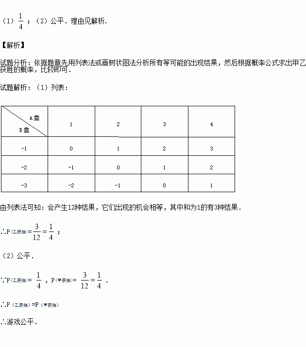 Èçͼ£¬¼×¡¢ÒÒÁ½ÈËÔÚÍæ×ªÅÌÓÎϷʱ£¬×¼±¸ÁËÁ½¸ö¿ÉÒÔ×ÔÓÉת¶¯µÄתÅÌA£¬B£¬Ã¿¸öתÅ̱»·Ö³ÉÃæ»ýÏàµÈµÄ¼¸¸öÉÈÐΣ¬²¢ÔÚÿһ¸öÉÈÐÎÄÚ±êÉÏÊý×Ö£®ÓÎÏ·¹æÔò£ºÍ¬Ê±×ª¶¯Á½¸öתÅÌ£¬µ±×ªÅÌÍ£Ö¹ºó£¬Ö¸ÕëËùÖ¸ÇøÓòµÄÊý×ÖÖ®ºÍΪ0ʱ£¬¼×»ñʤ£»Êý×ÖÖ®ºÍΪ1ʱ£¬ÒÒ»ñʤ£®Èç¹ûÖ¸ÕëÇ¡ºÃÖ¸ÔÚ·Ö¸îÏßÉÏ£¬ÄÇÃ´ÖØ×ªÒ»´Î£¬Ö±µ½Ö¸ÕëÖ¸ÏòÄ³Ò»ÇøÓòΪֹ£®