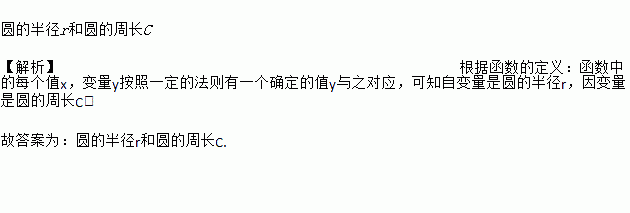 圆的半径r和圆的周长C 【解析】根据函数的定义:函数中的每个值x,变量y按照一定的法则有一个确定的值y与之对应,可知自变量是圆的半径r,因变量是圆的周长C. 故答案为:圆的半径r和圆的周长C.