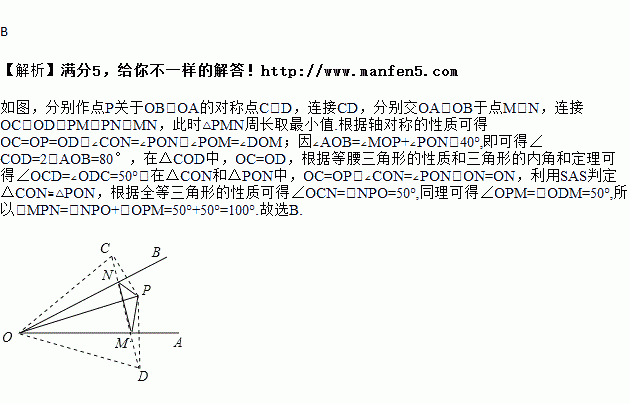 如图,点P是∠AOB内任意一点,且∠AOB=40°,点M和点N分别是射线OA和射线OB上的动点,当△PMN周长取最小值时,则∠MPN的度数为( )
