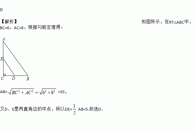 D 【解析】如图所示,在RT△ABC中,BC=6,AC=8,根据勾股定理得: AB==10, 又D、E是两直角边的中点,所以DE=AB=5.故选D.