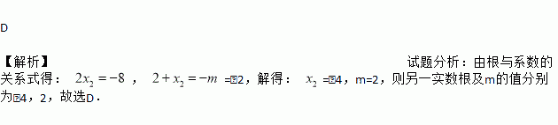 已知关于x的一元二次方程x2+mx﹣8=0的一个实数根为2,则另一实数根及m的值分别为( )