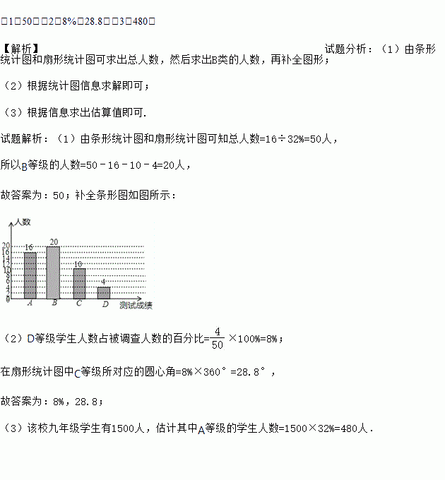 (2016云南省昆明市)某中学为了了解九年级学生体能状况,从九年级学生中随机抽取部分学生进行体能测试,测试结果分为A,B,C,D四个等级,并依据测试成绩绘制了如下两幅尚不完整的统计图;
