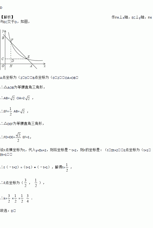 如图,已知直线y=﹣x+2分别与x轴,y轴交于A,B两点,与双曲线y=交于E,F两点,若AB=2EF,则k的值是( )
