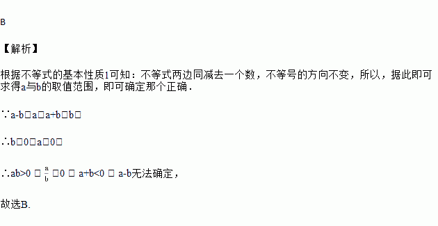 A. ab<0 B. >0 C. a+b>0 D. a-b<0