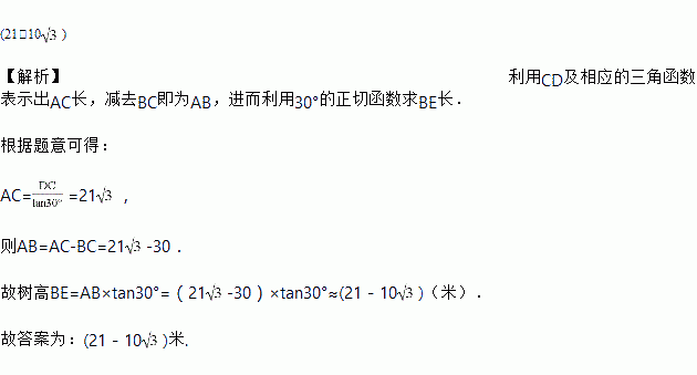 小明想利用小区附近的楼房来测同一水平线上一棵树的高度.如图,他在同一水平线上选择了一点A,使A与树顶E、楼房顶点D也恰好在一条直线上.小明测得A处的仰角为∠A = 30?.已知楼房CD高21米,且与树BE之间的距离BC = 30米,则此树的高度约为_________米.