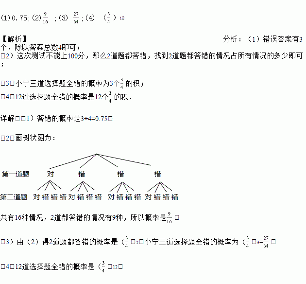 (3)小宁三道选择题全错的概率是 ;