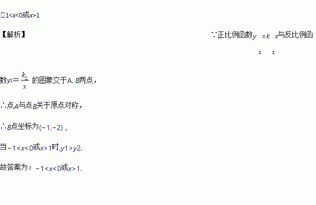 如图,正比例函数y1=k1x与反比例函数y2=的图象交于A、B两点,根据图象可直接写出当y1>y2时,x的取值范围是________________.