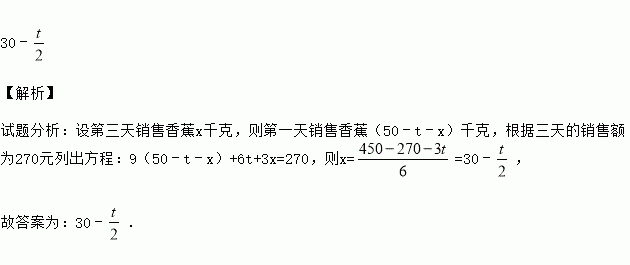 某水果点销售50千克香蕉,第一天售价为9元/千克,第二天降价6元/千克,第三天再降为3元/千克.三天全部售完,共计所得270元.若该店第二天销售香蕉t千克,则第三天销售香蕉 千克.