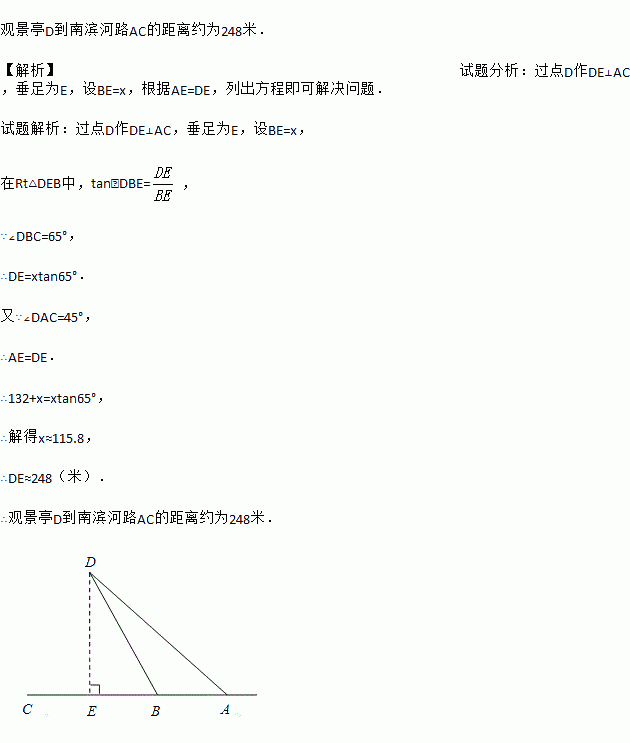 美丽的黄河宛如一条玉带穿城而过,沿河两岸的滨河路风情线是兰州最美的景观之一.数学课外实践活动中,小林在南滨河路上的A,B两点处,利用测角仪分别对北岸的一观景亭D进行了测量.如图,测得∠DAC=45°,∠DBC=65°.若AB=132米,求观景亭D到南滨河路AC的距离约为多少米?(结果精确到1米,参考数据:sin65°≈0.91,cos65°≈0.42,tan65°≈2.14)![]()