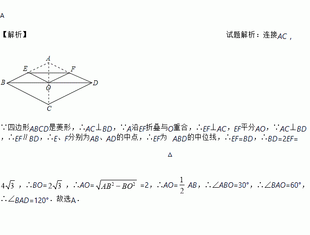 如图,将边长为4的菱形ABCD纸片折叠,使点A恰好落在对角线的交点O处,若折痕EF=,则∠A=( )
