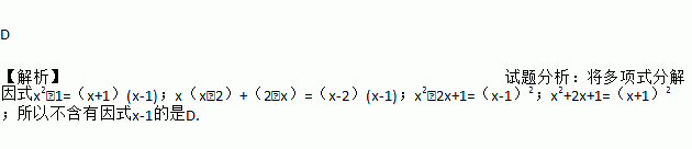 D 【解析】试题分析:将多项式分解因式x2﹣1=(x+1)(x-1);x(x﹣2)+(2﹣x)=(x-2)(x-1);x2﹣2x+1=(x-1)2;x2+2x+1=(x+1)2;所以不含有因式x-1的是D.
