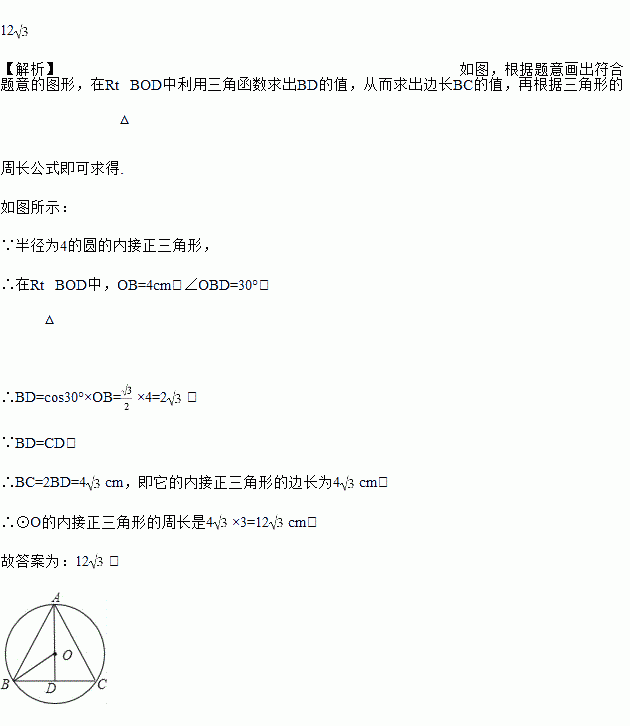 ⊙O的半径为4cm,则⊙O的内接正三角形的周长是_____cm.