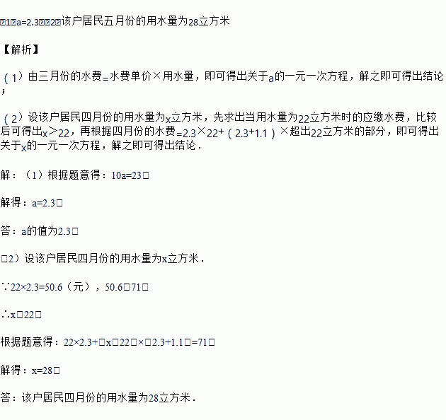 (2)若该户居民2017年五月份所缴水费为71元,求该户居民五月份的用水量.