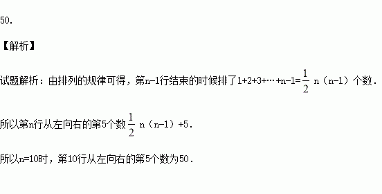 将全体正整数排成一个三角形数阵,根据上述排列规律,数阵中第10行从左至右的第5个数是 .