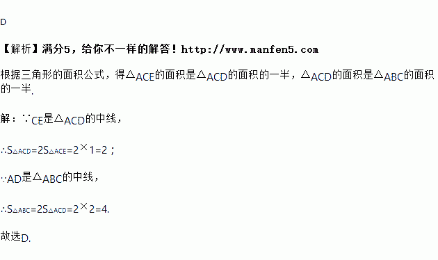 如图,AD是△ABC的中线,CE是△ACD的中线.若△ACE的面积是1,则△ABC的面积是( )