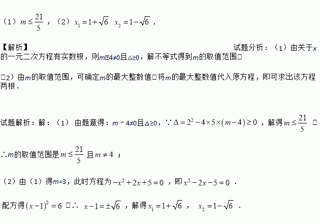 (1),(2) . 【解析】试题分析:(1)由关于x的一元二次方程有实数根,则m﹣4≠0且△≥0,解不等式得到m的取值范围; (2)由m的取值范围,可确定m的最大整数值,将m的最大整数值代入原方程,即可求出该方程两根. 试题解析:【解析】 (1) 由题意得:m﹣4≠0且△≥0,∵,解得 ,∴m的取值范围是且; (2)由(1)得m=3,此时方程为,即. 配方得,∴ ,...